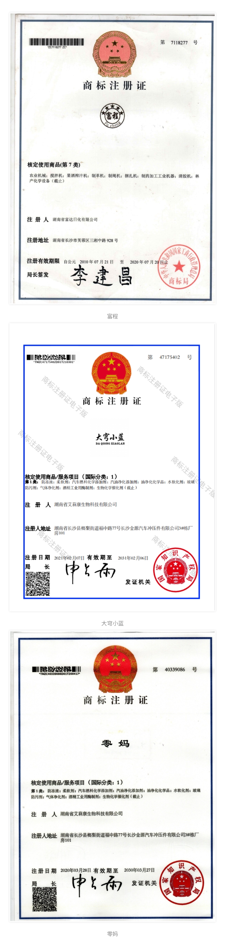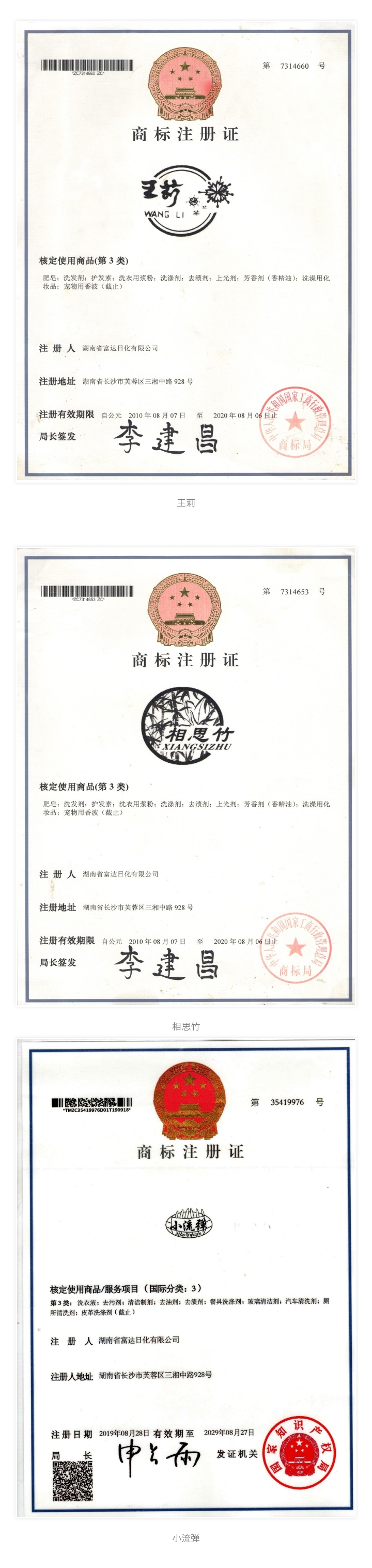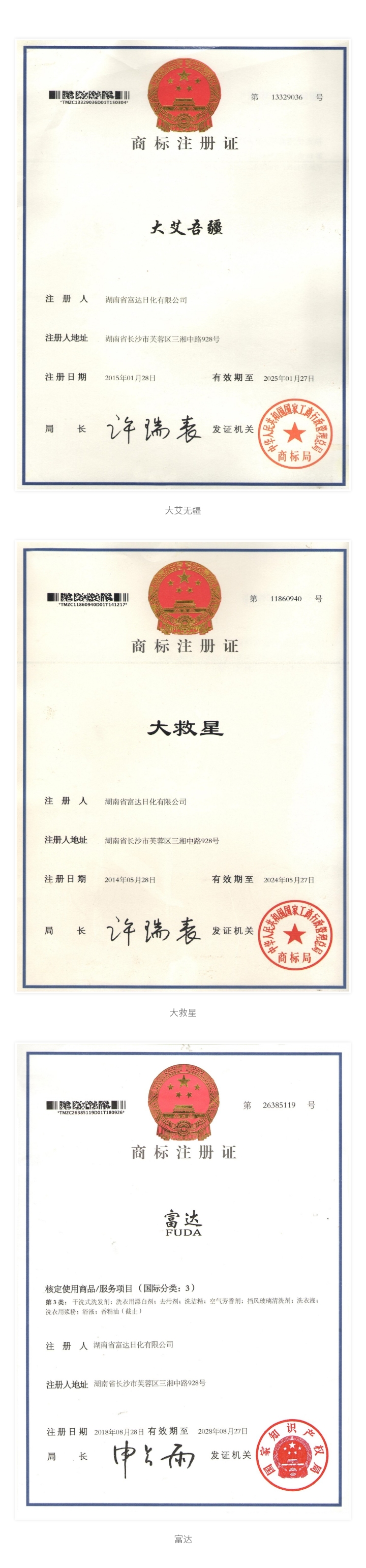 答:富達(dá)日化所有洗滌產(chǎn)品和設(shè)備商標(biāo)均經(jīng)過國家商標(biāo)局正式核準(zhǔn)注冊,可授權(quán)購機用戶免費合法使用。