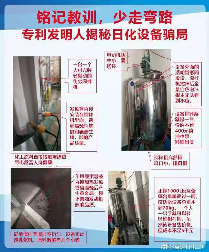 天津、武漢、濰坊等地不法商販竟敢將發(fā)熱管直接接觸腐蝕性化工原料的洗潔精設(shè)備洗衣液設(shè)備車用尿素設(shè)備公開銷售給創(chuàng)業(yè)者,這種危害人身健康,人為制造偽劣產(chǎn)品的的日化設(shè)備銷售人渣的商業(yè)行為,為何屢禁不止?
