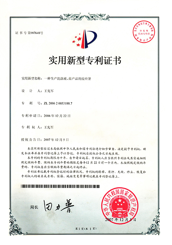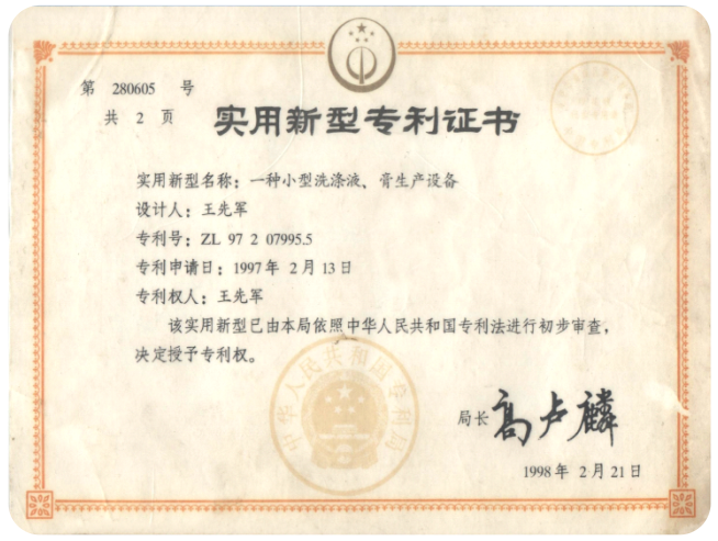 1997年2月曾獲一種小型洗滌液、膏生產(chǎn)設(shè)備國(guó)家專利 |