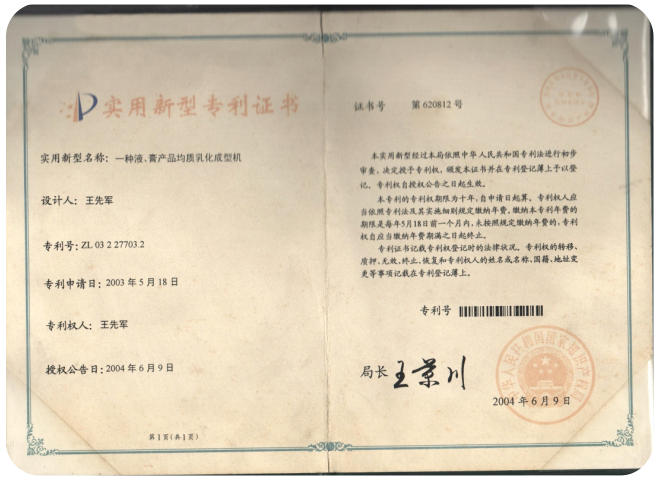 2003年5月曾獲液、膏產(chǎn)品均質(zhì)乳化機(jī)國(guó)家專利 |