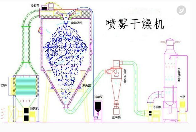 工藝原理:空氣經(jīng)過(guò)濾和加熱,進(jìn)入干燥器頂部空氣分配器,熱空氣呈螺旋狀均勻地進(jìn)入干燥室。料液經(jīng)塔體頂部的高速離心霧化器,(旋轉(zhuǎn))噴霧成極細(xì)微的霧狀液珠,與熱空氣并流接觸在極短的時(shí)間內(nèi)可干燥為成品。成品連續(xù)地由干燥塔底部和旋風(fēng)分離器中輸出,廢氣由引風(fēng)機(jī)排空。