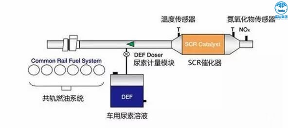 SCR系統(tǒng)包括尿素罐(裝車用尿素溶液)、SCR催化反應(yīng)罐。SCR系統(tǒng)的運行過程是:當(dāng)發(fā)現(xiàn)排氣管中有氮氧化物時,尿素罐自動噴出車用尿素溶液,尿素溶液和氮氧化物在SCR催化反應(yīng)罐中發(fā)生氧化還原反應(yīng),生成無污染的氮氣和水蒸氣排出。