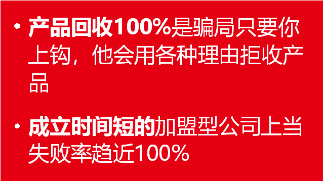 十三、項(xiàng)目加盟騙局大都會(huì)利用人們對電視廣告宣傳的傳統(tǒng)認(rèn)可心里,殊不知現(xiàn)在的常規(guī)電視廣告不到2萬元,就可以同時(shí)在央視七套等省級(jí)衛(wèi)視多個(gè)電視臺(tái)同時(shí)播放45次5秒鐘的廣告,由于廣告部門受利益驅(qū)使對項(xiàng)目合格性合法性審核不嚴(yán)的原因,只要出示營業(yè)執(zhí)照同時(shí)交錢就可以打廣告,所以,越來越多的創(chuàng)業(yè)者因?yàn)槠烹娨晱V告而上當(dāng)受騙;