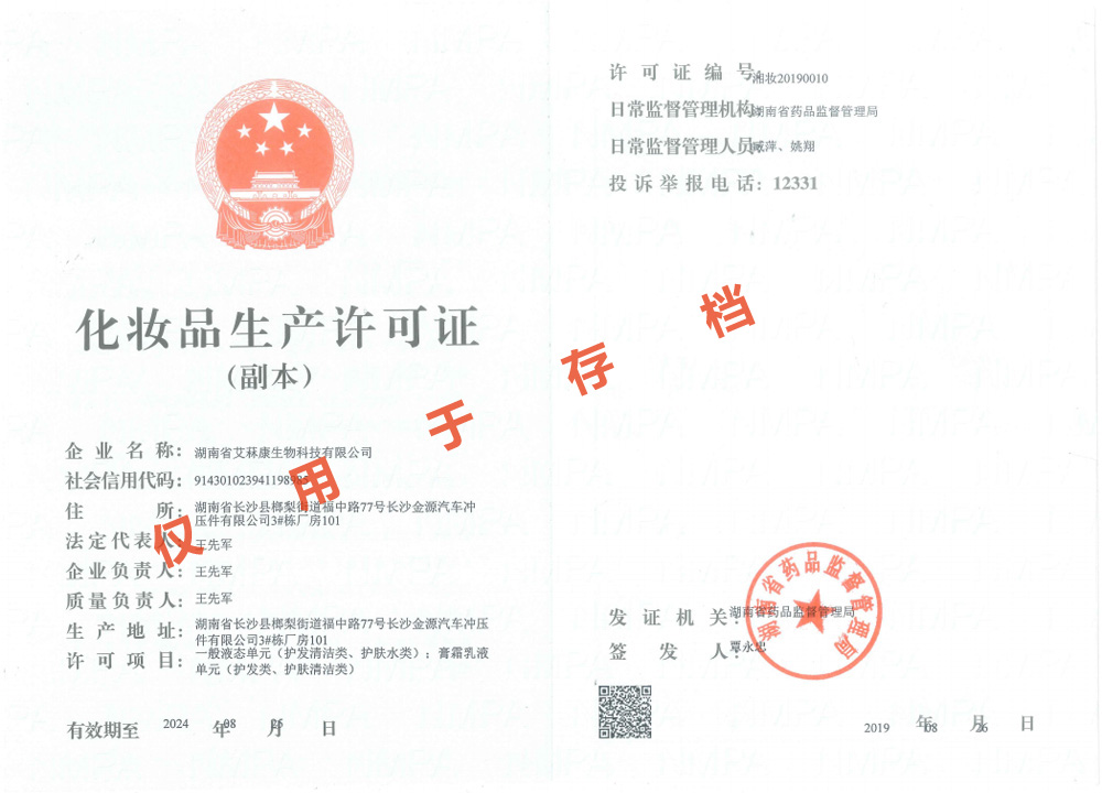 多項專利發(fā)明人王先軍 手機(jī):150-7483-5702 手機(jī):195-7316-0288經(jīng)食藥監(jiān)局領(lǐng)導(dǎo)專家們層層審核并一致通過,富達(dá)艾菻康公司正式獲得了化妝品生產(chǎn)許可證。消息傳來,公司全體員工群情激奮,熱烈歡呼。此次順利通過現(xiàn)場驗收并取得化妝品生產(chǎn)許可證,標(biāo)志著公司已完全具備了生產(chǎn)和銷售一般液態(tài)單元(護(hù)發(fā)清潔類、護(hù)膚水類);膏霜乳液單元(護(hù)發(fā)類、護(hù)膚清潔類)的資質(zhì),這將成為公司進(jìn)軍化妝品行業(yè)的新起點。
