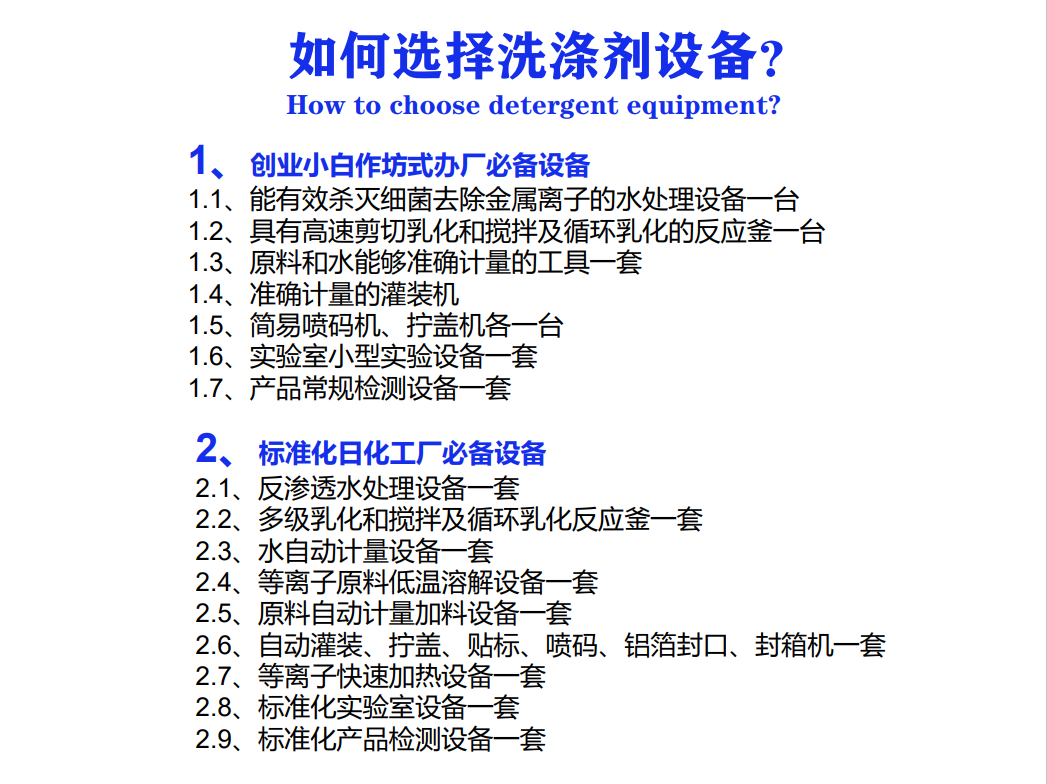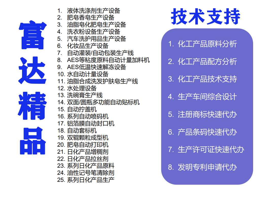 該公司的主要產(chǎn)品包括但不限于洗衣粉及洗衣粉生產(chǎn)設(shè)備、洗衣液、洗發(fā)香波、洗潔精、透明皂、香皂、洗手液、生態(tài)去污粉、洗發(fā)香波、衣領(lǐng)凈、洗瓶劑、消毒液等60多種日化產(chǎn)品生產(chǎn)設(shè)備和技術(shù)。