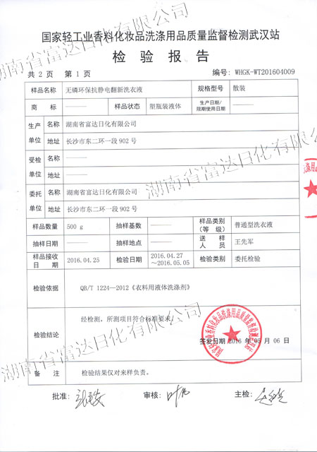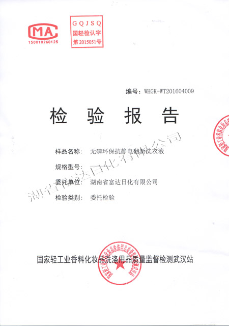 多項專利發(fā)明人王先軍 手機:150-7483-5702 手機:195-7316-02882016年4月,富達日化用戶周先生反饋: 在周先生銷售洗衣液、洗滌劑的周邊,有一種翻新洗衣液很走俏,他想加盟,可加盟門檻很高,問公司能否生研發(fā)生產(chǎn)出類似的產(chǎn)品。收到客戶的反饋后,作為多項專利的發(fā)明人,早在10年前就根據(jù)氧化還原反應(yīng)原理研究過衣物翻新洗衣液。經(jīng)過2個多月的研發(fā),無磷環(huán)??轨o電衣物翻新洗衣液按照國家標準研發(fā)成功,并送檢國家輕工業(yè)質(zhì)量監(jiān)督檢測武漢站,于5月下旬通過環(huán)評檢測。
