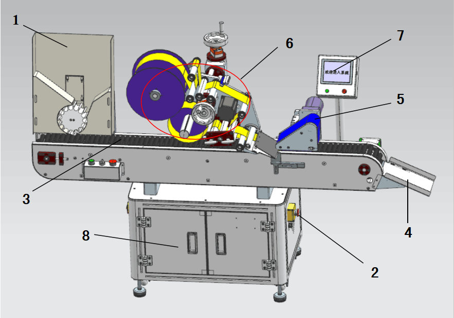 貼標機的機械結構和各部分功能,如下圖標注所示。