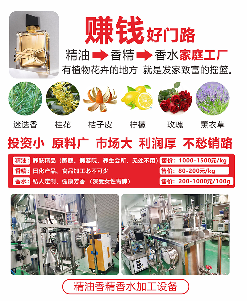 多項專利發(fā)明人王先軍 手機:150-7483-5702 手機:195-7316-0288設備投資五萬元以上即可生產。精油用于養(yǎng)生,美容院、足浴中心;香精用于食品行業(yè)、日化產品行業(yè);香水用于諸多追求品質生活的男女消費者的喜愛。合成精油香精香水的原料來源廣泛,主要是艾草、迷迭香、玫瑰等所有植物根桿或花卉,廠房占地面積20平方米以上,一人就可生產,由于用途廣,市場不愁銷路。利潤空間大,投資風險小,適合大眾創(chuàng)業(yè)。